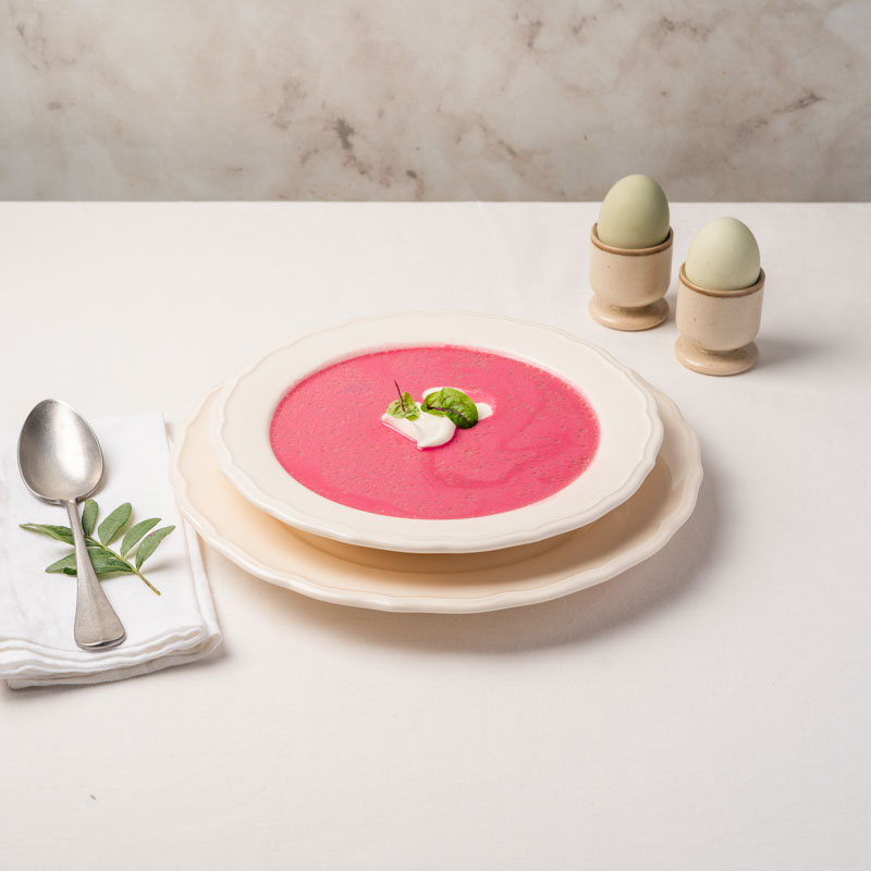 Intensywnie buraczany, z przyjemną kwasowością zakwasu i łagodnym, kremowym wykończeniem. Sprawdzi się jako elegancki początek uroczystego obiadu w gronie najbliższych.