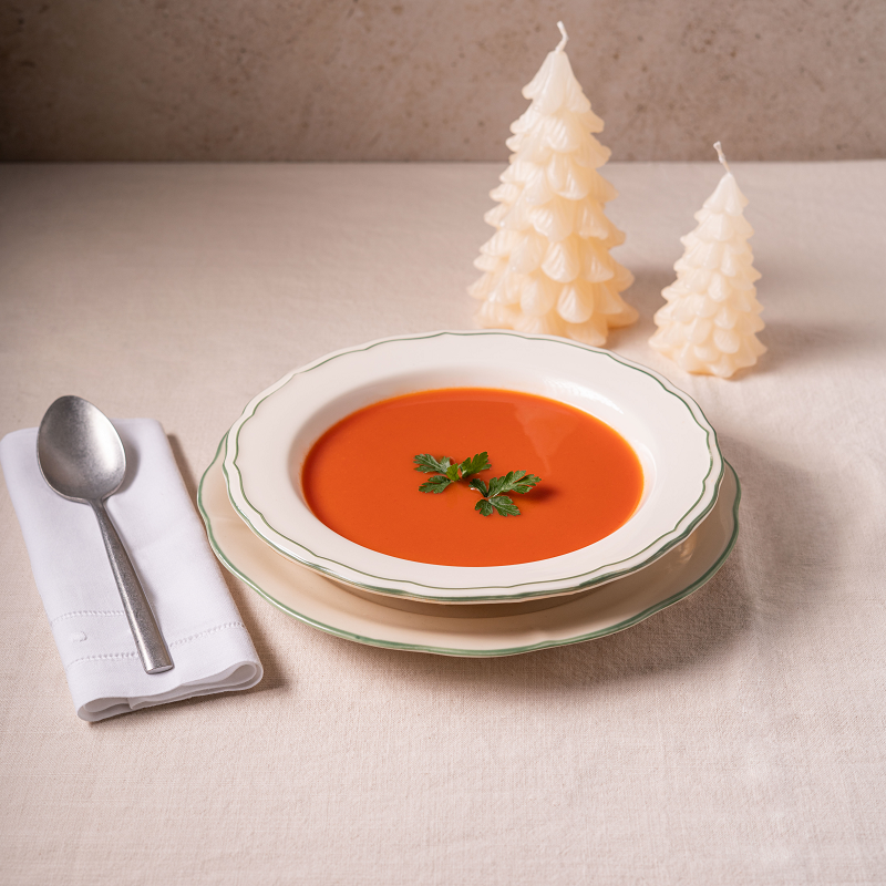 Klasyczna, kremowa zupa z dojrzałych pomidorów, doprawiona odrobiną śmietany i bazylii. Jej intensywny kolor i zapach przywodzą na myśl domowe ciepło i beztroskę rodzinnych spotkań.