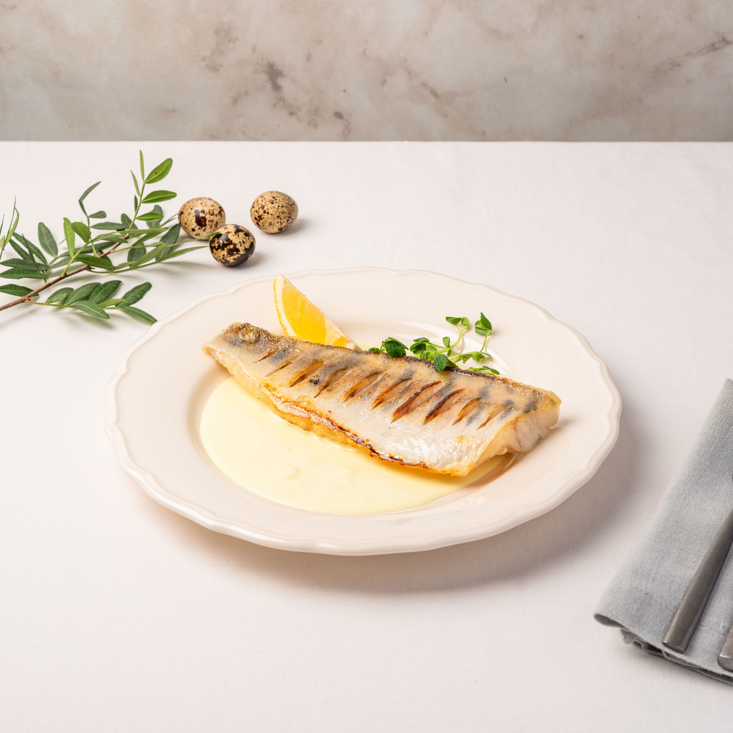Sandacz pozostaje delikatny i sprężysty, a cytrusowy sos podkreśla jego naturalną świeżość. To wiosenna kompozycja smaków, która wnosi do menu subtelny, orzeźwiający akcent. Wyjątkowe danie główne w naszym cateringu wielkanocnym i eleganckim menu na uroczyste przyjęcia.
