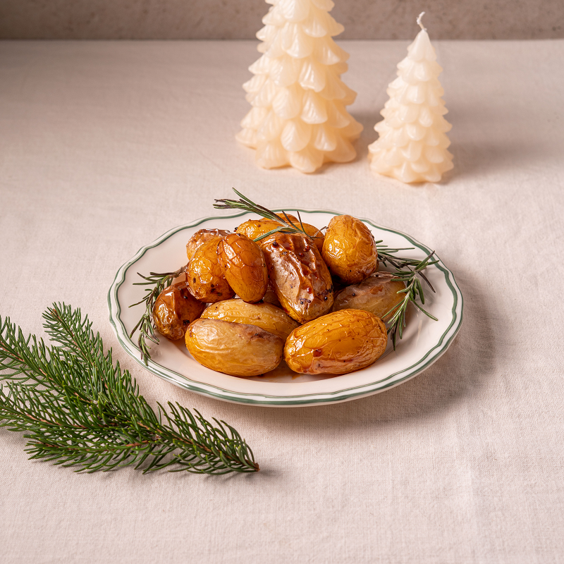 aromatycznie pieczone, lekko karmelizowane ziemniaczki o miodowej glazurze. Ich subtelna słodycz i złocisty kolor rozświetlają świąteczny stół, dodając daniom eleganckiego akcentu.